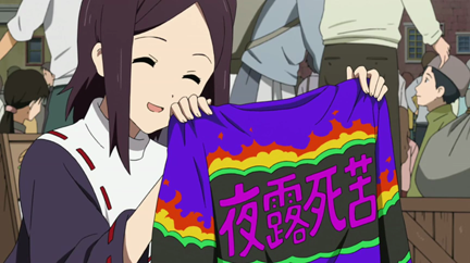 The Japanese language is dead nowadays, and its phonographs were Chinese character, which are now ideograms. And those are the hierographs of Yumina-oneechan’s religion. Just like Catholics use Latin, Buddhists use Sanskrit. And “Yoroshiku(best regards)” is written in Chinese character phonetically, “夜露死苦(Night, dew, death, pain)”. It’s surprising that these kind of ideograms are still alive, even though they are regarded by some as “sacred letters.”