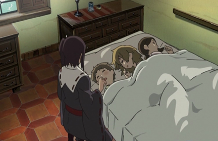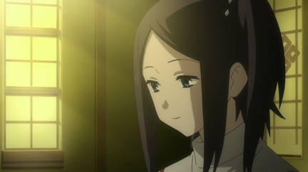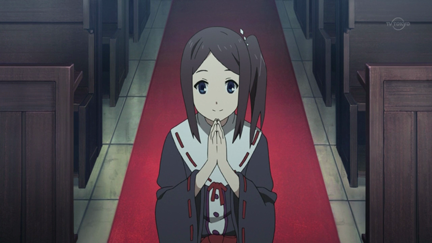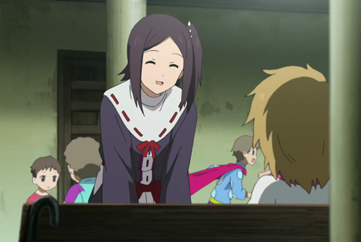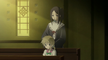 Ah, Yumina-onechan ! Ahhhhhh, she is the nanny of an orphanage. She is like Lady Mary looking after the Lillian Girls’ Academy. She is a sister (nun), big sister, and kannagi (shaman). Yes, she is a miko (female shaman)–a sister and miko combined. Sisu-miko? That is like a combination of a Shinto shrine and a Christian church. Her religion seems to be a combination of Shinto and Christianity. And, she takes care of war orphans at her shrine-church. By that she guides children. It is like leading lost lambs to the right path. And children yearn after Sister Yumina by calling her “Yumina Oneechan!”