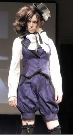 stood out against the deluge of sweetness. The amalgam of the hat, the domineering bow, striped vest, Victorian romper, for lack of a better word, and knee high stockings establishes a boardroom presence rivaling that of a bespoke Armani suit. And it does so in purple!