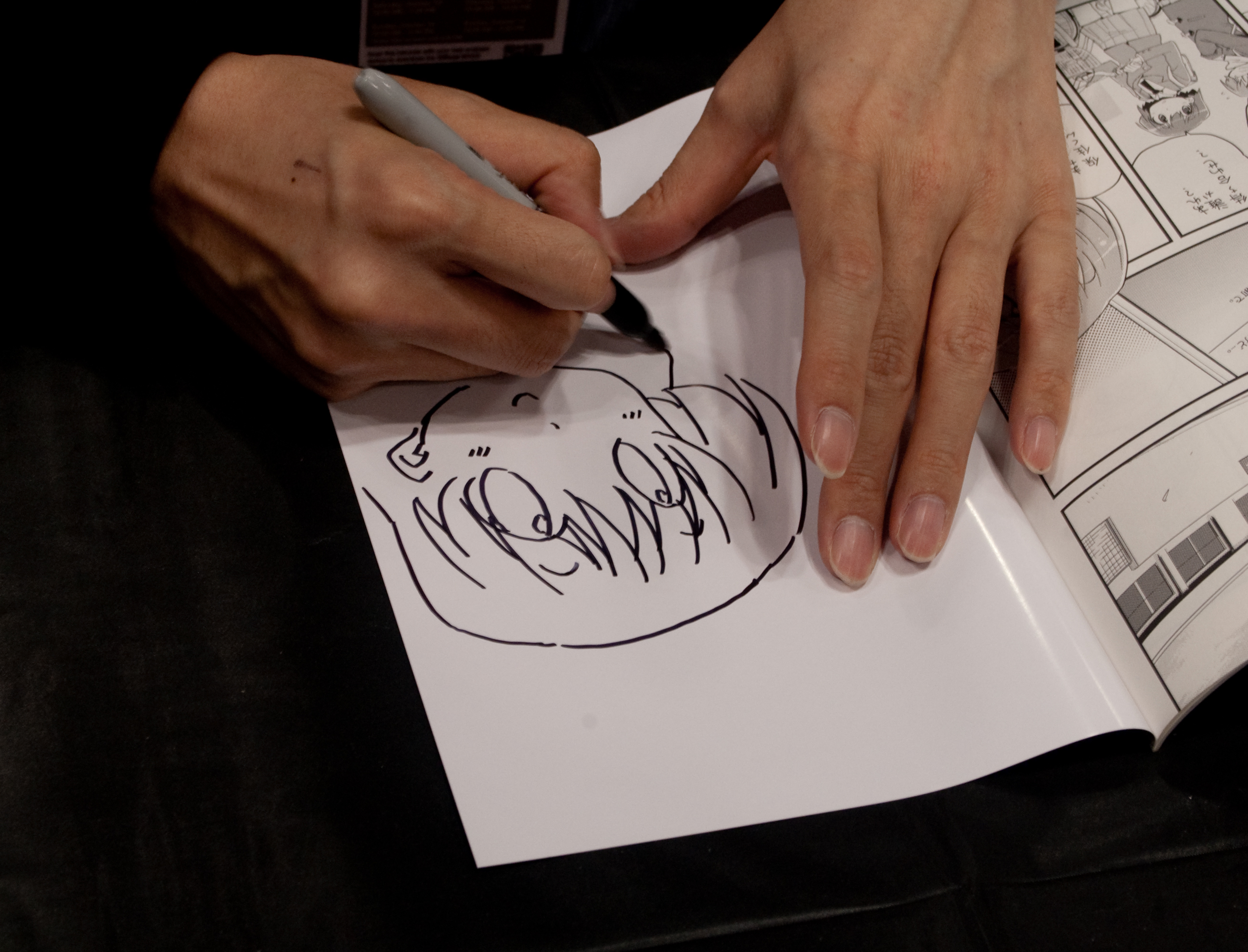 Directly after my interview with Nagumo-sensei, he began his signing session with patiently waiting fans. Due to being camera shy, I was allowed to take a photo of his hands as he drew and signed Japanese copies for Let’s Eat Ramen.