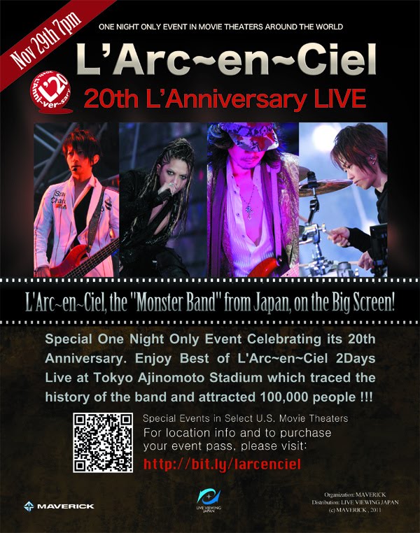 Now the DVD has been released, and to celebrate L’Arc en Ciel’s accomplishments, a one night movie screening event presented by Live Viewing Japan happened in selected US cities. I am happy to say that New York City was one of them. Not sure how did other cities fared, in terms of attendance, but in NYC it was a small audience. Tickets were $20, but for about two-ish hours.. it was a nice event to sit and just be blasted with surround sound and behold the energy/excitement that was Laraku’s 20th Anniversary concert. Watching this concert gave me an idea just what would it be like next year for their World Tour 2012.