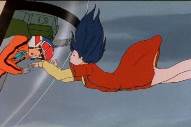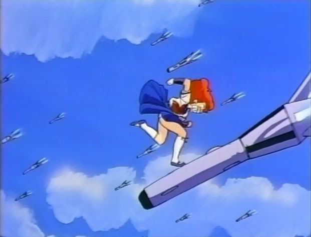 Forgiving the reality that the OVAs that followed leave so much to be desired, the original animator’s anime, Project A-ko remains a dynamo of inspired lunacy nearly thirty years on. But the gag that never ceases to leave me smitten takes place in the final third, as rivals A-ko & B-ko are forced to cease their mass destruction-laden feud in order to rescue the obnoxious C-ko from gender-ambiguous aliens who have descended upon the Earth with terrifying force. A-ko, the redheaded heroine of exceptional strength lacks the ability of flight, and quickly must improvise a strategy of reaching the humongous alien craft by way of playing leap frog with Self Defense Force Jets (most of which are shot down, leaving A-ko little choice but to jump from jet to jet). BUT it’s upon getting closer to the ship that our hapless hero takes on a nightmare run that would give many platform game lovers some form of PTSD! Apparently mostly animated by Dirty Pair designer/animator, Tsukasa Dokite, A-ko breathlessly leaping from missile to missile, with her donning the most exasperated face remains an all-time medium favorite.