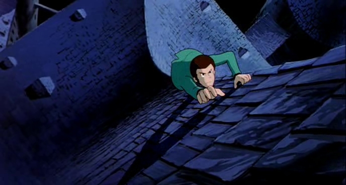 While it has become increasingly niche to consider Miyazaki’s Cagliostro Castle to be the cream of the Lupin III crop, I remain a Cagliostro devotee largely because it remains one of the most directorially consistent, and entertaining of the franchise. But what also makes it such a remarkable experience even now, is the animation and art direction which continue to impress me. There are just too many great action and comedy beats here to list. So when I have to pick one that gives me the face-cracking smiles every time, it has to be the scene in which the mater thief uses the cloak of night to climb his way to a castle tower to reach the captive princess, Clarisse. With merely a little rope with hooks, a few taut-string rockets, and a cigarette lighter to assist him, his mission to reach from one tower to another is pure comic suspense. From the lush background, to the tile roofing, to all of Lupin’s stumbling amidst the breeze, it’s all the setup one needs before he loses that one little rocket…and..