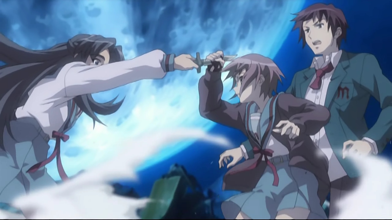 As budgets for animation have increased, spectacle in our anime has exponentially followed suit. The problem then, of course lands in how it is delivered. While I may have expressed enthusiasm about a number of wild moments, the biggest element that binds them all together is simple; a sense of build. Great moments cannot merely happen, they must be earned. They must come as a response to all that has come before it. The precendent must exist before it can be broken. And in the initial season of the surprise hit, Haruhi Suzumiya No Yuutsu, it comes almost out of nowhere, and in the process it lives up to the buildup in regards to a single character; the largely silent bookworm, Yuki Nagato. Throughout the course of the show’s original out of chronological order narrative, we are privy to the revelation that Nagato claims to be an alien. A being from a digitized world overlooked by an all-seeing data overmind. And as the stories build, we get fragments of her abilities, but it’s nothing compared to when the show’s centra narrator finds himself in a perplexing life or death situation in an empty classroom of all places. The moment of her appearance is exciting enough, bit the ensuing battle culled almost perfectly from the Tanigawa light novels is astonishing to the point of masterful. Turns out she’s the real deal, and the reality is beyond comprehension. One classical theory out there is that all art is a conversation between artists, and in the case of the cyber-battle over a once-very-skeptical lead character, this is the kind of visualization of such a world that has long been neglected in film form, and more common on cyberpunk literature, made corporeal in a high school fantasy setting! It’s wholly bonkers and brilliant. Heck, it even does The Matrix one better by exhibiting what happens to mass, manipulated by way of code. The kind of marriage between concept and action that is capable of greater inspiration.