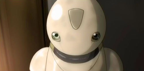 It is here that Rikuo & Masaki begin to meet the cafe’s few patrons, and within six brief episodes, explore their own feelings on a world populated by machines from those created by man, and those self-made by a society afraid of its own shadow. The social implications of a populace surrounded by subservient creations has been a staple of not merely anime, but of literate science fiction for well over several decades now, and Yoshiura’s short series is definitely another in this pantheon, but has an interesting distinction in how it treats the subject matter with an unexpected reverence for Asimov’s concerns, and places them in a more intimate setting. Watching the complete series, there are only five settings throughout the entire project, the majority of which takes place in Eve No Jikan as the undisclosed nation outside brims with a growing miasma of prejudice against the mechanical whom have comfortably nestled into every part of the societal body. Many stories have covered this material before, but to take the quiet , kuuki-kei approach is a novel one closer in tone to an episode of The Outer Limits than Blade Runner, that is, if TOL had an episode comfortable with a cup of coffee and good conversation.