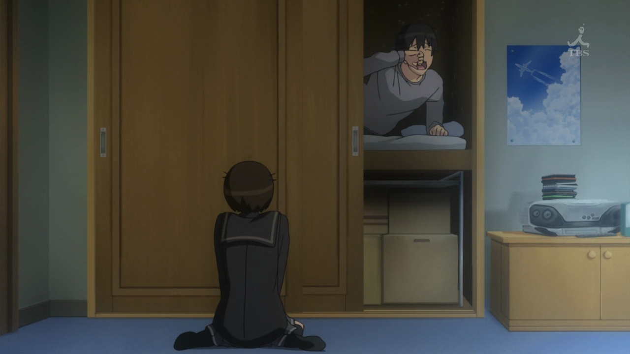 This dude, Tachibana Junichi, a 17 years old junior student in high school, I mean I thought he was really a hikikomori at first, because he literally sleeps in Oshi-ire (closet). He was totally like me since I used to sleep in the closet in my adolescent years too. I thought only Doraemon would sleep in Oshi-ire in 2-D, but this protagonist, Tachibana Junichi, also sleeps in Oshi-ire.