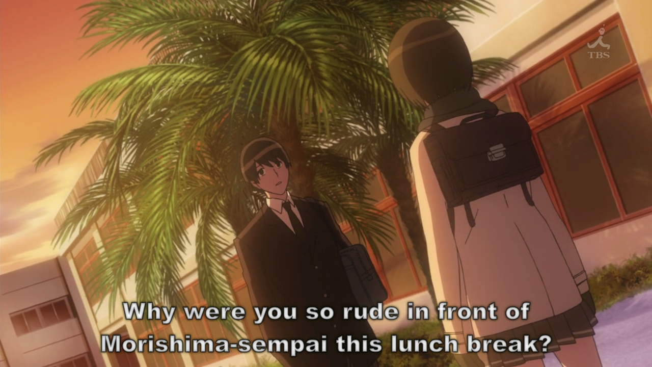 I’m not a critic. I’m just a hikky otaku. If you think this anime has surpassed the state of ordinary without knowing the original, then you think like that. To me, the plot went too quick, as if it was some sort of speed dating. But maybe it was natural since Morishima-senpai already had an eye on him. Actually she was the one made a move, initiating a conversation with Tachibana. How awesome is that? I wish American girls were as pursuant as Senpai. I heard Swedish girls are very pursuant, hitting on sensitive types like otaku. I better move to Sweden?