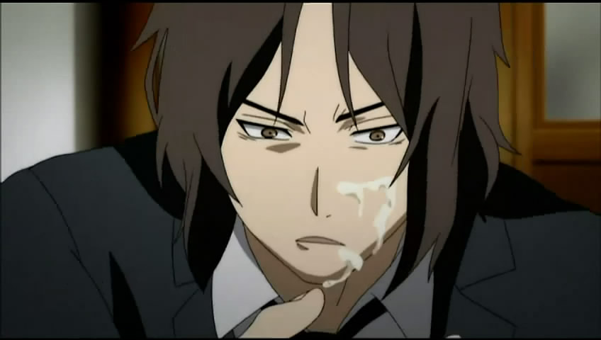 It was pretty funny for me when Nigaitou pretended to pounce all over Nori, and Yomi just throw the tea on him and the thing just blew on his face. But it’s the scene back in the office that tipped me off.
