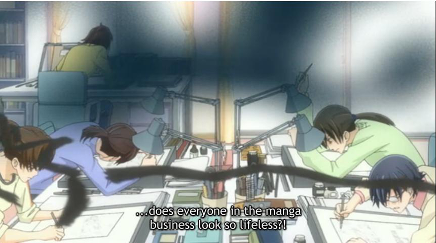 The state of the mangaka and her assistants definitely reminded me of when I heard Kazuko Tadano and Hiromi Matsushita speak at Otakon 2008, about the length of time they devoted to animating and creating Sailor Moon. This other aspect is also from an anime perspective, but Hayao Miyazaki, and the late Satonshi Kon also logged incredible amounts of time to just create and create. Yes creation is a tedious work, but just thinking about it just thrills me, since the finished product can be taken in a couple of ways.