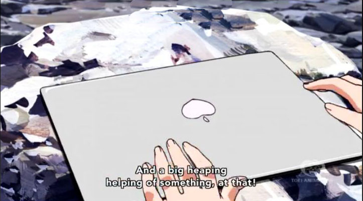 I seriously watch this anime for the food! *drools* And then everything kinda goes down the hill. There’s a battle that seriously reminded me of parts like Blue Dragon. Then there were some humorous parts in this episode, such as Tina’s laptop obviously an Apple parody, and then her way of eating Chocolates.. it is no wonder that she’s not overweight with how much she indulges.