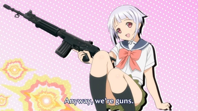It will come as no surprise to the reader that Upotte objectifies girls. That is, after all, literally the premise of the show: that girls can actually be guns. But perhaps the truly artistic element of its premise is that statement in reverse: that guns – inanimate objects – can be girly.