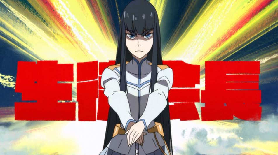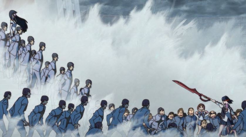 With a “boyish” attitude, and readiness to take on a seemingly invincible army of single-minded stormtroopers in strength enhancing uniforms, the show’s apparent bent comes at the latter half of the episode when Ryuko stumbles upon, and is accosted by a talking, animated (!!) seifuku known as Senketsu. And what ensues, is best described as an attempt at a humorous rape scene, which ends with our heroine becoming near-invincible. (again, interpret as you will) And while one can also see the episode’s remaining minutes as something of a sideeye to such a creative choice, as Ryuko seems to maintain her aim as unyielding avenger, it is pretty hard to shake off. Also in the choice’s defense, is a reminder that a lot of Gurren Lagaan’s more playful subtext involved the occasional homoeroticism that tipped the balance in a fun sort of manner. And it isn’t hard to see how this is element is going to play out with the first episode’s head baddie in masculine-dressed student council president, Satsuki Kiryuin. Not sure how to feel about that one.