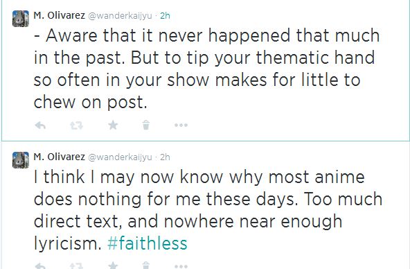 To expound feelings about the upcoming tweets, I cannot help but feel like anime as a medium has long been teetering between iconographic storytelling and didactic overkill. And as a longtime viewer of many a show, it has come to mind that a big reason why so many shows tend to leave me cold, is that so many writers find themselves in some deep need to information dump, or hyper-explain the motivations behind the story, rather than illustrate them by way of the power inherent. While a great many series (see; Evangelion, Kill la Kill, etc.) make their mark by being pretty open with their inner thought process, some of the more interesting, and often impactful series find ways to allow the art and animation do much of the legwork.