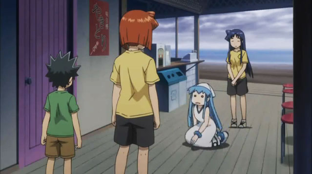And really, this is what it is all about for me. Economy of talent, which also…strangely..shows up in some of the least expected places. Had you asked me a few weeks ago regarding the story of Masahiro Anbe’s Shinkyraku! Ika Musume coming to Crunchyroll, I would have scoffed like so many an anime hipster. Flash forward to now, and I’m eating those notions with a giant, Pee-Wee Herman-sized spoon. As stupid as the premise truly is [Squid Girl, embittered by the carelessness of land dwelling humans declares invasion by disrupting a beachside noodle shop, only to become an employee, and friend to the proprietors-See? SEE?], it is the clever combination of fun writing (some by scribe Michiko Yokote), and clever animation that sets it apart from the current pack. A show like this simply shouldn’t work, and yet it does in spite of itself.